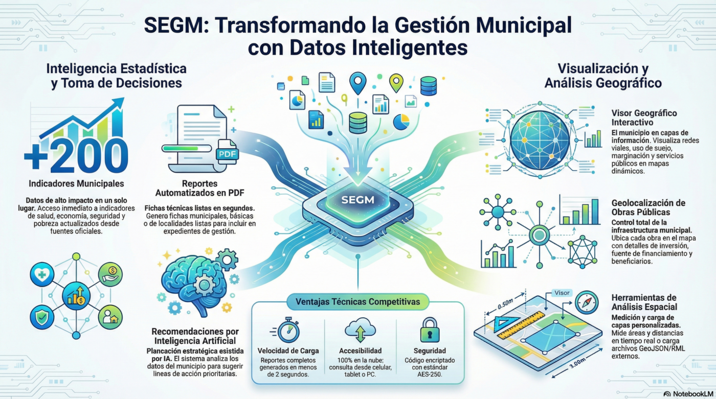 Podrás generar fichas informativas de temas como población municipal, seguridad pública, rezago social, pobreza, agricultura, etc. En el Sistema Geográfico podrás visualizar y descargar más de 20 mapas municipales que le permitirá detectar mejor determinada situación.